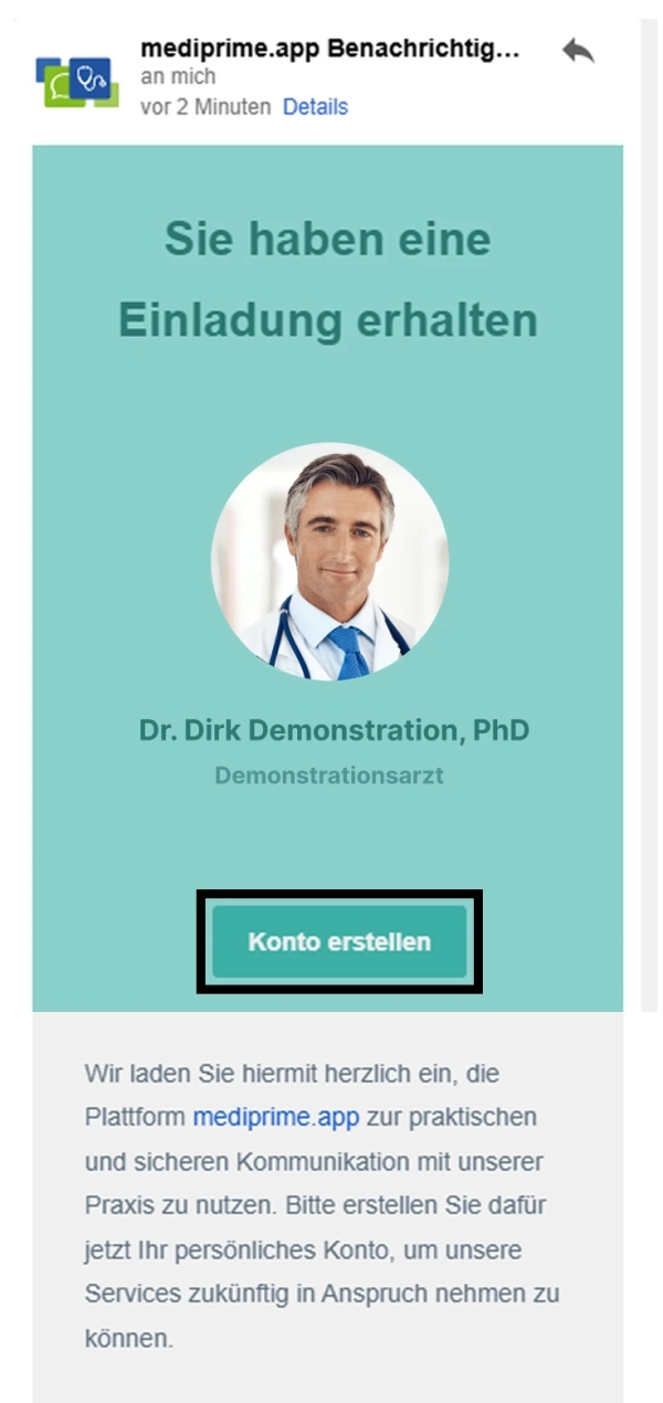 Sobald Sie Ihre Einladung per E-Mail erhalten haben öffnen Sie diese und klicken Sie auf "Konto Erstellen".
