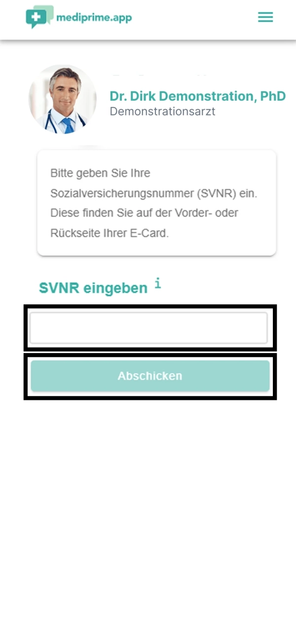 Geben Sie Ihre Sozialversicherungsnummer in das dafür vorgesehene Feld ein um sich eindeutig zu identifizieren. Klicken Sie danach auf "Abschicken"